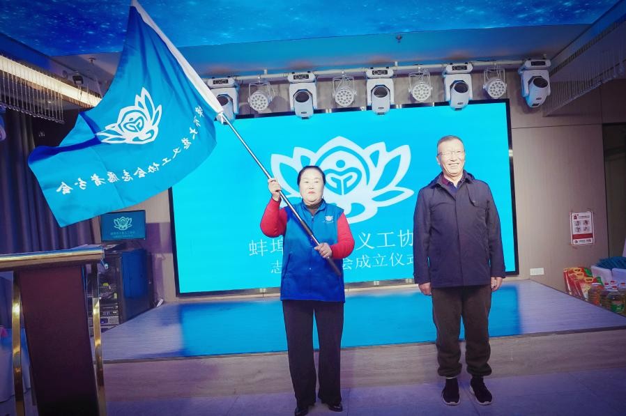 随后,仪式进入核心环节:蚌埠市大慈义工协会会长徐峰宣读分会成立文件,正式宣告志愿者分会扎根屾河社区;协会理事于波为分会授会旗,志愿者分会会长邓广英接旗,一面鲜红的会旗,承载着协会的信任与社区的期盼,标志着分会志愿服务工作正式启航,这支扎根社区、服务邻里的核心团队,赢得了现场阵阵掌声。